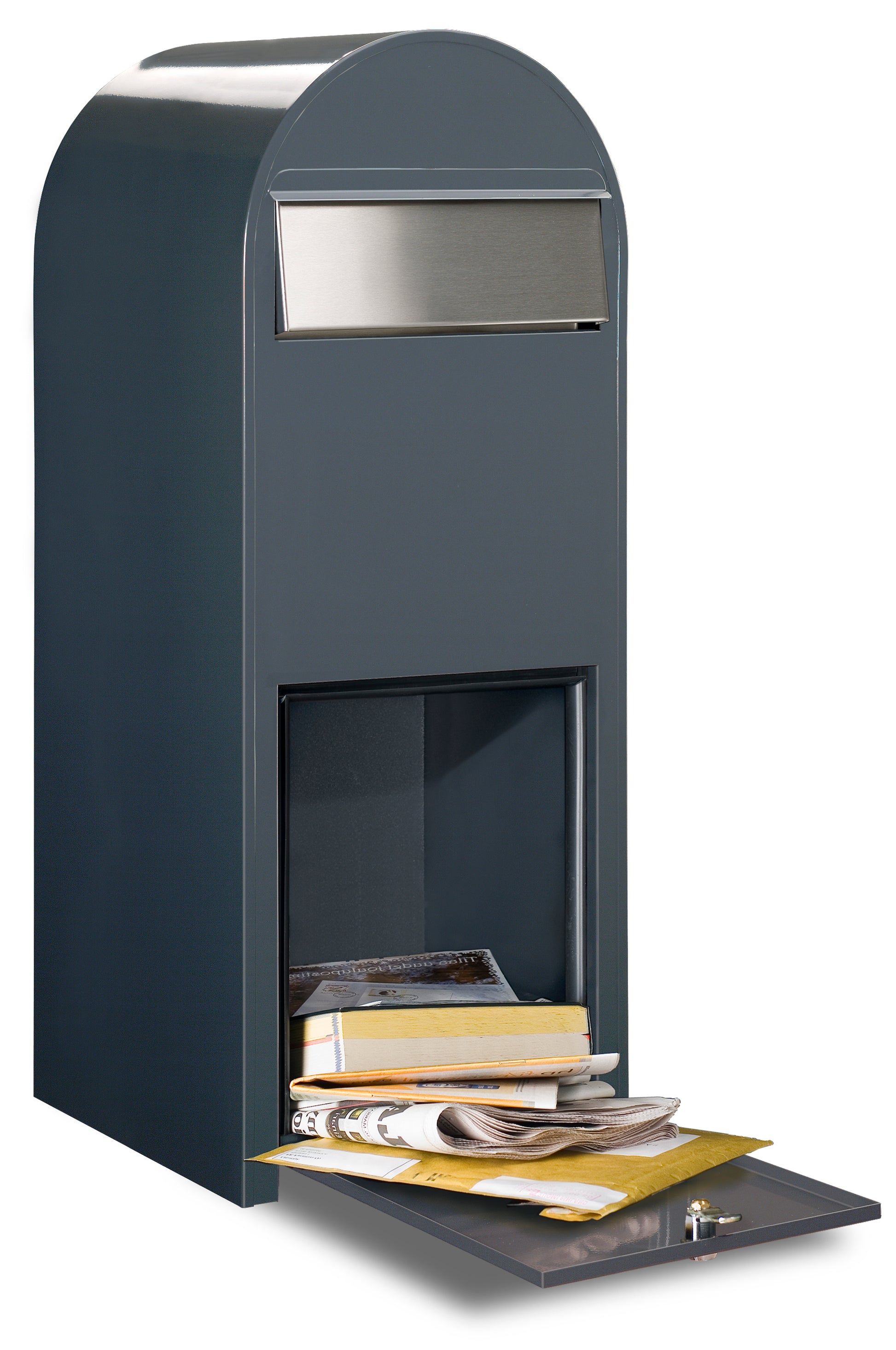 Bobi Jumbo Front Access Package Grey Mailbox with Stainless Steel Mail Slot and Round Black Post Combo