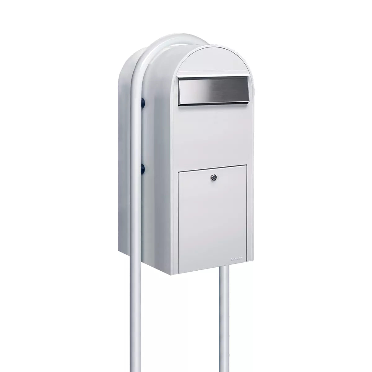 Bobi Jumbo Front Access Package White Mailbox with Stainless Steel Mail Slot and Round White Post Combo